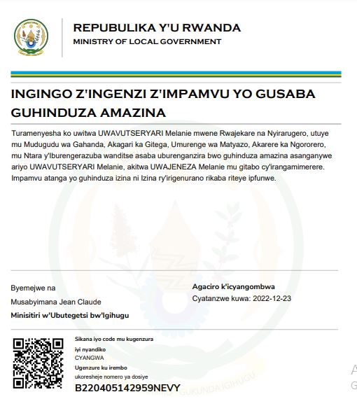 Uwitwa UWAVUTSERYARI Melanie yasabye guhindura amazina mu buryo bwemewe n’amategeko akitwa UWAJENEZA Melanie mu bitabo by’irangamimerere.