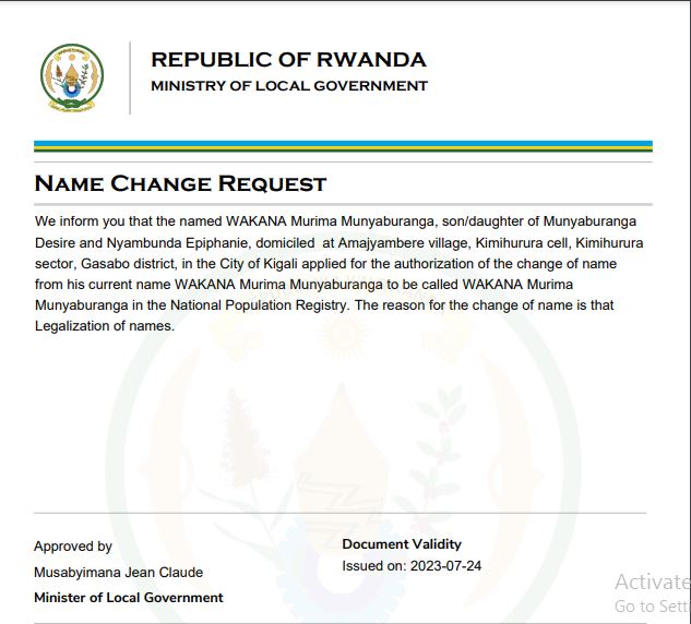 Uwitwa WAKANA Murima Munyaburanga yasabye guhindura amazina mu buryo bwemewe n’amategeko WAKANA Murima Munyaburanga mu bitabo by’irangamimerere.