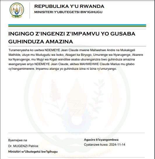Uwitwa NDEMEYE Jean Claude yasabye guhindura amazina mu buryo bwemewe n’amategeko akitwa MAHWEHWE Claude Marius mu bitabo by’irangamimerere!