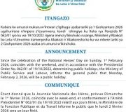 Minisiteri y’Abakozi ba Leta n’Umurimo (MIFOTRA) yatangaje ko ku wa 2 Gashyantare 2026 ari umunsi w’ikiruhuko rusange mu rwego rwo kwizihiza Umunsi w’Intwari.