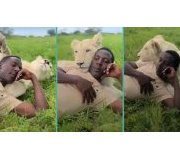 Umugabo yateje impaka nyuma yo kugaragara yishimanye n’intare