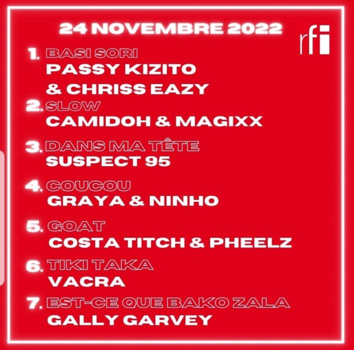Kuva ku wa 24 Ugushyingo 2022, icyumweru kigiye kwirenga indirimbo ‘Basi sorry’ ya Passy Kizito na Chris Eazy iyoboye urutonde rwa zirindwi zikunzwe zo muri Afurika kuri radiyo mpuzamahanga y’u Bufaransa (RFI).