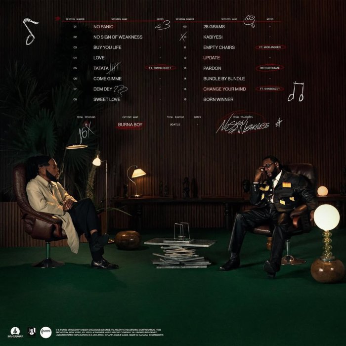 “No Sign of Weakness” ni album Burna Boy ahishuramo urugendo rushya rw’ubuzima bwe, ibitekerezo bye byimbitse n’imbaraga ashyira mu muziki.