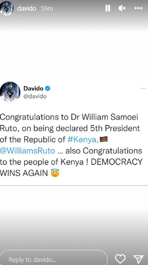 Davido yagaragaje ko yishimiye insinzi ya Ruto ashimira abaturage ba Kenya