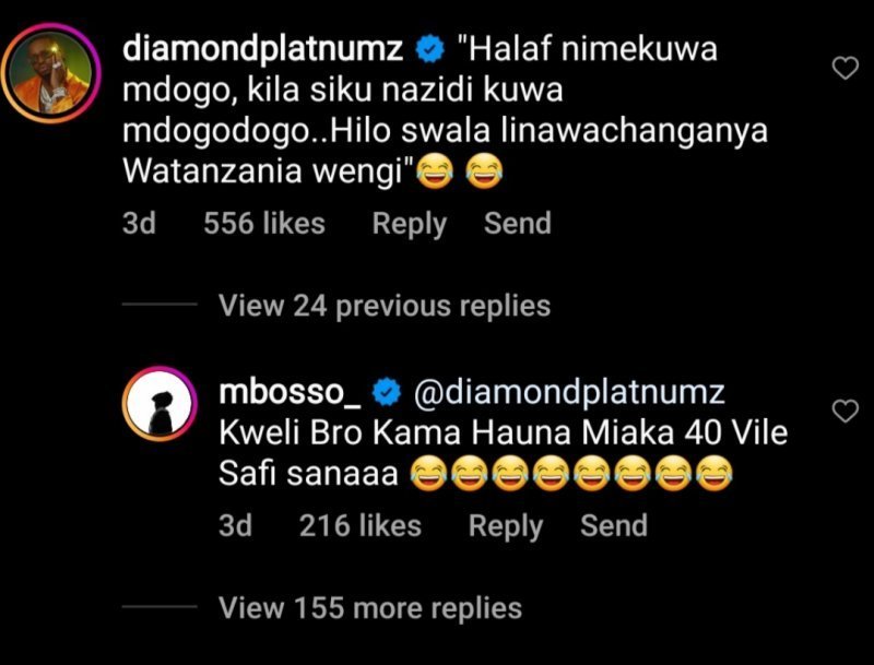 Umwe mu bantu bavuze kuri ubu butumwa ni inshuti ye, Mbosso. Ati "Ni byo muvandi nk’umuntu udafite imyaka 40."