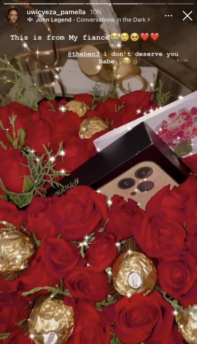 Miss Pamella nawe ahita yasazwe n’amarangamutima nyuma yo guhabwa impano ya terefone ahita ashimira umukunzi we bitegura kurushinga.