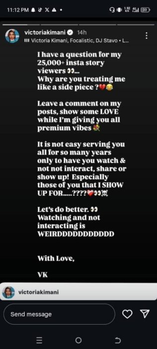 Umuhanzikazi ukunzwe muri Kenya no hanze yayo yagaragaje ko atishimira abamukurikira ku mbuga nkoranyambaga bareba ibyo abasangiza ntibatange ibitekerezo ibizwi nka “comments” kandi ntako aba atagize ngo abahe ibyiza.