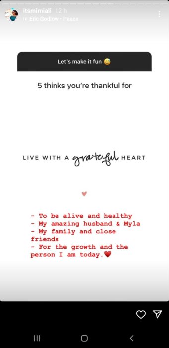 Ati "kuba ndi muzima kandi mfite ubuzima, umugabo wanjye w’agatangaza na Myla (umwana wa bo), umuryango wanjye n’inshuti za hafi no kuba narakuze ndetse n’umuntu ndi we uyu munsi."