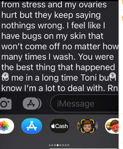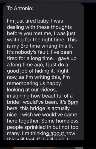 Akomeza agira ati"Ntabwo ari ikosa ry’uwo ariwe wese, narananiwe, nataye icyizere mu gihe kirekire gishize.Ariko ngerageza kubihisha ubwo ndimo nkwandikira. Ndimo no kwibuka ibihe byacu by’ibyishimo n’amashusho, ntekereza n’umugeni mwiza nari kuzavamo aha ndi ni 05 z’umugoroba iki kiraro kirasa neza".