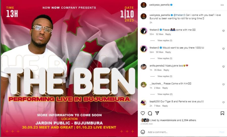 Ni ubusabe uyu mugore yahaga umugabo we bugaca amarenga ko aba bombi bashobora kuzaba bari kumwe i Bujumbura ku wa 1 Ukwakira 2023 mu gitaramo cyatumiwemo The Ben.