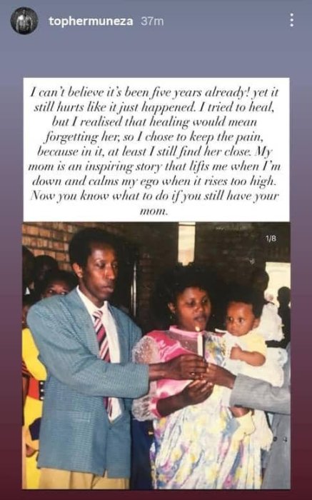 Abinyujije mu butumwa yasangije abamukurikira kuri Instagram ahanyuzwa ubutumwa bumara amasaha 24 gusa, Christopher yibutse nyina agaragaza ko akibana n’icyo gikomere.