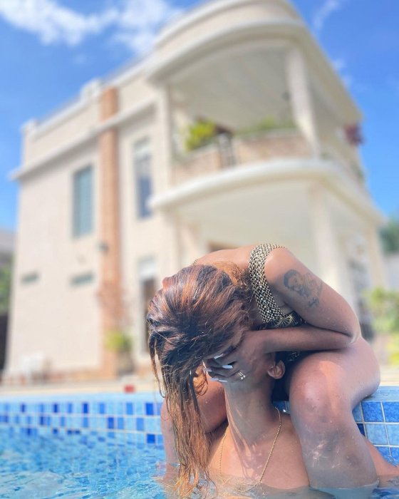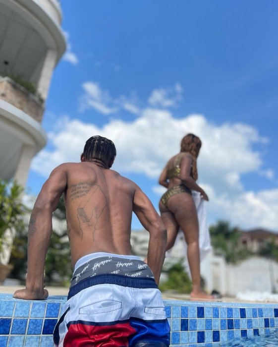Ku mbuga nkoranyambaga,hagaragaye aba bari gusomanira kuri pisine mu buryo budasanzwe ndetse bakomeza gushimangira icyanga kiri mu myaka itatu bamaze bari mu munyenga w’urukundo.
