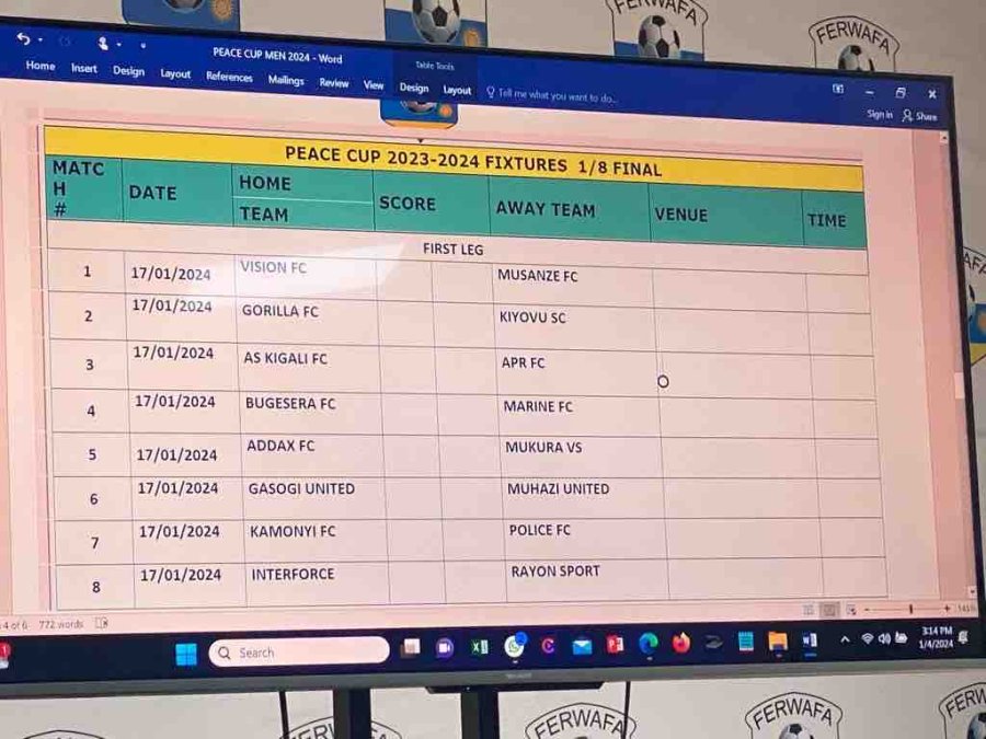 Nyuma y’amajonjora y’ibanze y’Igikombe cy’amahoro 2024,Kuri uyu wa Kane tariki ya 4 Mutarama 2024 habaye Tombola y’uko amakipe azakina muri 1/8 cy’iki gikombe.