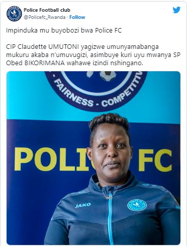 Bati “Impinduka mu buyobozi bwa Police FC. CIP Claudette UMUTONI yagizwe umunyamabanga mukuru akaba n’umuvugizi, asimbuye kuri uyu mwanya SP Obed BIKORIMANA wahawe izindi nshingano.”