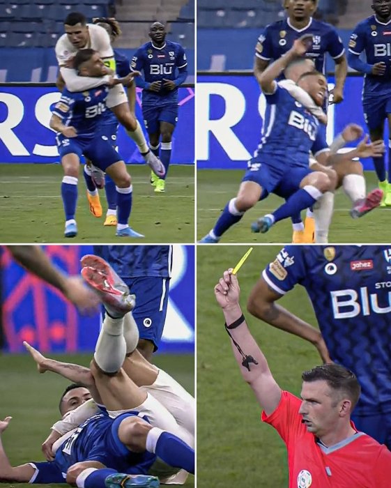Uyu mukinnyi ukomoka muri Portugal yafashe umukinnyi wa Al Hilal wari umucitse, amushyira ukuboko mu ijosi ahuza n’ukundi, atangira kumuniga ubundi baramanuka bose bikubita hasi.