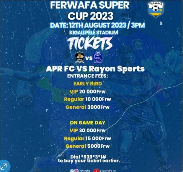Kuri uyu wa wa Gatandatu tariki 29 Nyakanga 2023, Ishyirahamwe ry’Umupira w’Amaguru mu Rwanda (FERWAFA), ryatangaje ibiciro by’umikino w’Igikombe kiruta ibindi uzahuza APR FC na Rayon Sports ku wa 12 Kanama 2023.