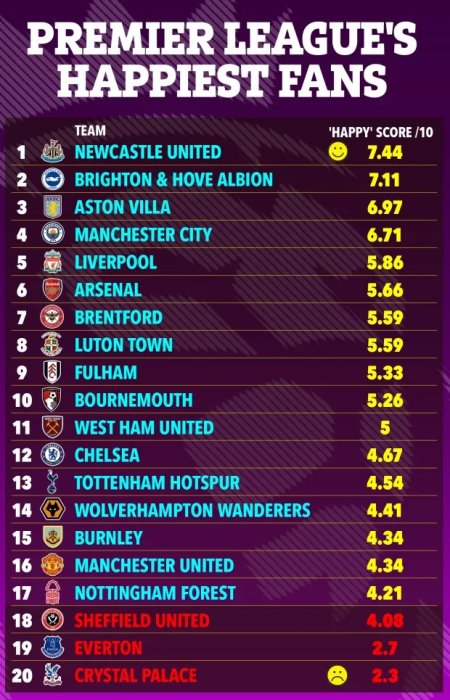 Uru rutonde rwagaragaje ko abafana ba Crystal Palace aribo batishimye kurusha abandi kuko ifite amanota 2.3 kuri 10.