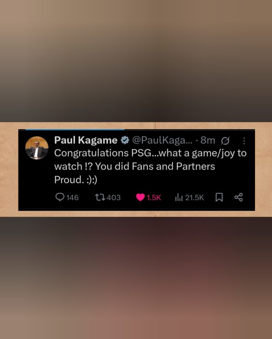 1. Nyakubahwa Perezida wa Repubulika Paul Kagame yashimiye ikipe ya Paris Saint Germain ku kuba yegukanye igikombe cya UEFA CHAMPIONS League 2024/2025. Umukuru w’Igihugu yavuze ko PSG iteye ishema abakunzi bayo ndetse n’Abafatanyabikorwa bayo.