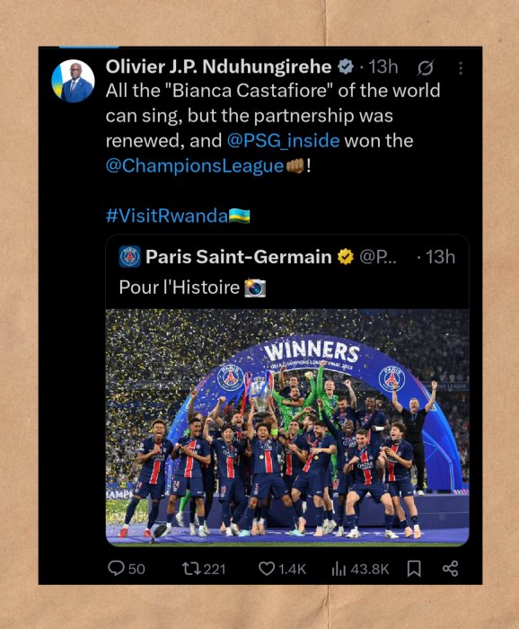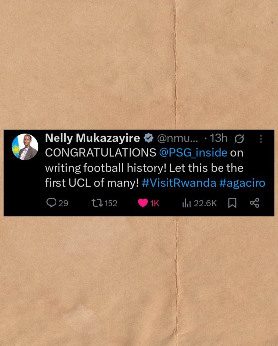 4. Minisitiri wa Siporo mu Rwanda Madamu Nelly Mukazayire yifashishije urukuta rwe rwa X yagaragaje ko yishimiye iki gikombe cya Paris Saint Germain ndetse yongeraho ko iki ari ikibanziriza ibindi byinshi iyi kipe y’abanyamujyi izegukana.