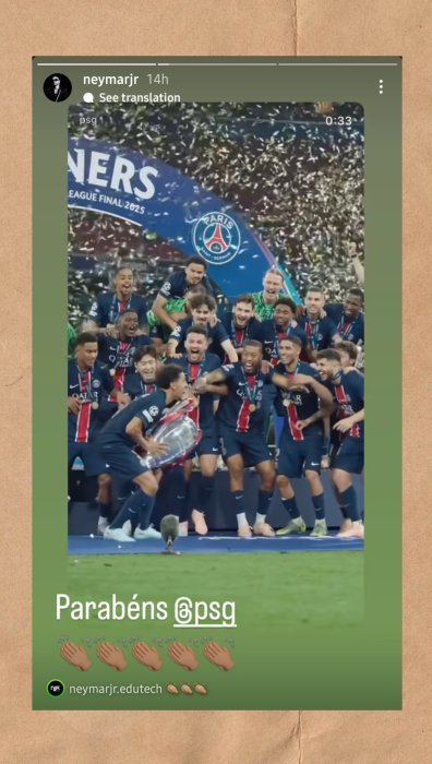 8. Rutahizamu Neymar Jr wakiniye iyi kipe ya PSG nawe yifashishije urukuta rwe rwa Instagram yashimiye ikipe yahozemo kubwo kuba yegukanye iki gikombe.