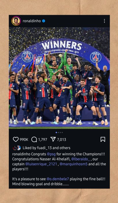 9. Rurangiranwa Ronaldinho Gaucho wakiniye iyi kipe mu myaka y’i 2003 nawe abinyujije ku rukuta rwe rwa Instagram yavuze ko byari ubukorikori kureba Ousman Dembele aconga agapira.