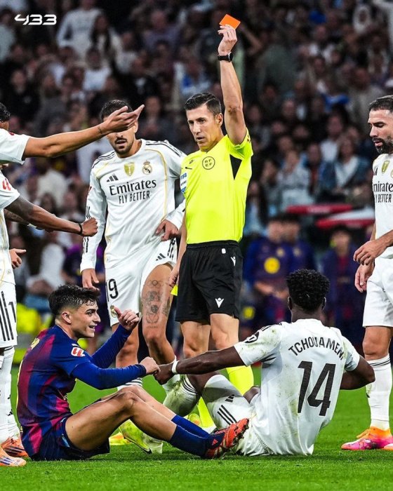 Mbere y’uko umukino urangira ku munota wa 90+10 Pedri wa FC Barcelone yabonye ikarita ya kabiri y’umuhondo yamuviriyemo itukura asohorwa mu kibuga .