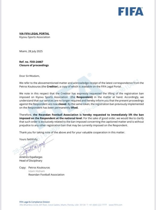 Uru rwego ruyobora umupira w’amaguru ku Isi kandi, rwahise rumenyesha Ishyirahamwe rya Ruhago mu Rwanda, Ferwafa, ko ikwiye gukuriraho iyi kipe ibihano by’imbere mu Gihugu bityo na ho ikemererwa kuhandikisha abakinnyi.