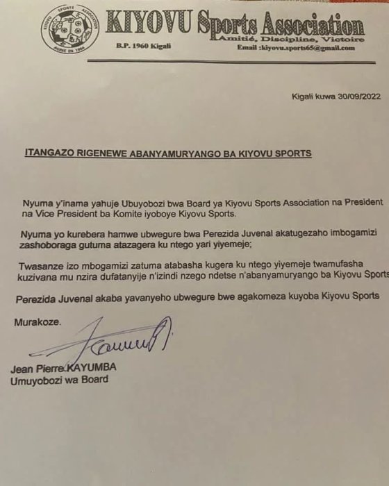 Iri tangazoryaje rikurikiranye n’irivuga ko kubera ubusabe bw’abagize ‘board’ ya Kiyovu Sports, Inama y’Inteko Rusange yari iteganyijwe ku wa Gatandatu tariki ya 1 Ukwakira 2022 yakuweho igihe izabera bakazakimenyeshwa.