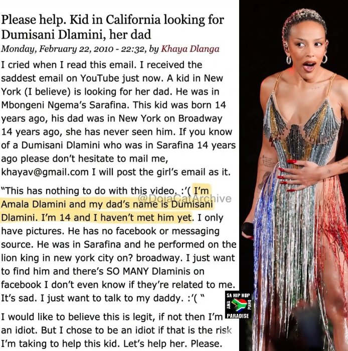 Yanditse agira ati "Nitwa Amala Dlamini, papa yitwa Dumisani Dlamini. Mfite imyaka 14 kandi sinigeze mubona na rimwe. Mfite amafoto ye gusa. Nta Facebook agira cyangwa ahandi nabasha kumubona. Yakinnye muri Sarafina kandi yakoreye no kuri Broadway i New York. Ndashaka kumubona. Hari abantu benshi bitwa Dlamini kuri Facebook sinzi niba hari n’uwo twaba dufitanye isano. Birambabaje… ndashaka gusa kuvugana na papa wanjye."