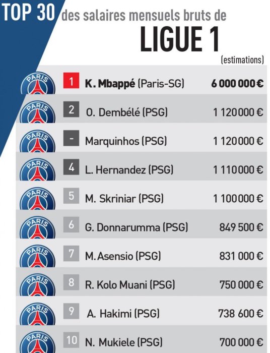 Umushahara wa Kylian Mbappé uruta uwa Ousmane Dembele (€1.12M), Marquinhos (€1.12M), Lucas Hernandez (€1.1M), Milan Skriniar (€1.1M) na Gianluigi Donnarumma (€850K) bose uwabo uwuteranyije.