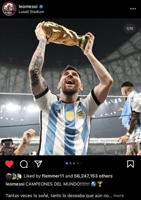 Ifoto ya Messi afashe igikombe cy’isi yabaye ifoto ya mbere y’umukinnyi ikunzwe kurusha izindi zose mu mateka ica ku ya Cristano Ronaldo ari gukina Chess nawe yari ifite uyu mwanya.
