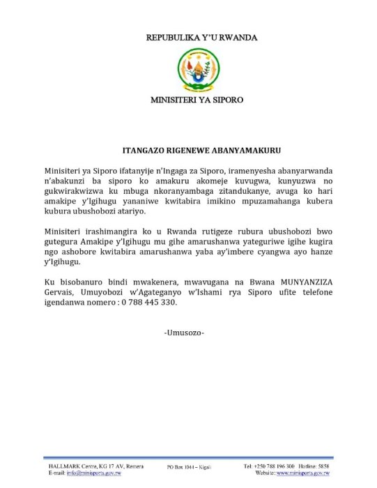 Mu itangazo yageneye Abanyamakuru,MINISPORTS yavuze ko ibyavuzwe n’abanyamakuru cyangwa byagaragaye ku mbuga nkoranyambaga ko hari amakipe y’igihugu ataritabiriye imikino mpuzamahanga kubera ikibazo cy’amikoro atari byo.