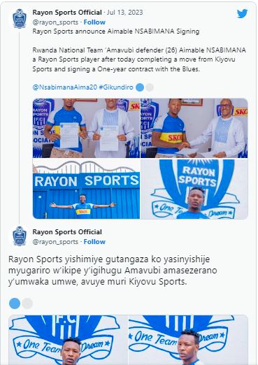 Ibicishije ku mbuga nkoranyambaga za yo, ikipe ya Rayon Sports yemeje ko myugariro Nsabimana Aimable yasinye amasezerano y’umwaka umwe muri iyi kipe.