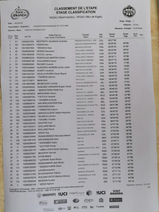 Restrepo Jhonatan (Androni) 6’27’, Alex Hoehn (Wildlife) 6’28’’, Alan Boileau (B&B Hotels) 6’29’’ mu gihe Cristian Rodriguez wambaye umwambaro w’umuhondo yaje ku mwanya wa 6 akoresheje iminota 6 n’amasegonda 35.Umunyarwanda waje hafi ni Mugisha Samuel wabaye uwa 35 akoresheje iminota 7 n’amasegonda 6.Yasizwe amasegonda 38 n’uwa mbere.