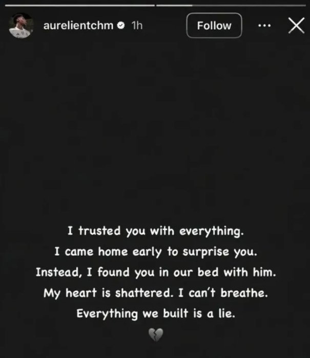 Ayo magambo byagaragaga ko yanditswe kuri instagram ahanyuzwa ubutumwa buzwi nka Story, yagira ati “Narakwizeye mu bintu byose. Natashye kare nshaka kugutungura. Ariko nasanze uri mu buriri bwacu uri kumwe na we [undi mugabo]. Umutima wanjye washegeshwe, sinshobora guhumeka. Ibyo twubakaga byose ni ikinyoma.”