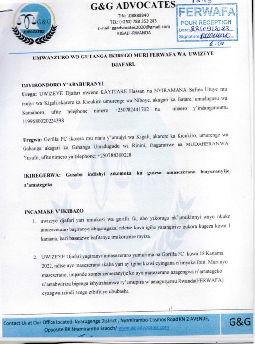 Abinyujije muri G&G Advocates ikunze kuburanira abakinnyi, Uwizeye Djafari ukina mu kibuga hagati, yatanze ikirego mu ishyirahamwe ry’umupira w’amaguru mu Rwanda, FERWAFA, arega ubuyobozi bw’ikipe ya Gorilla FC bwasheshe amasezerano mu buryo butubahirije amategeko nk’uko bigaragara mu nyandiko y’ikirego.
