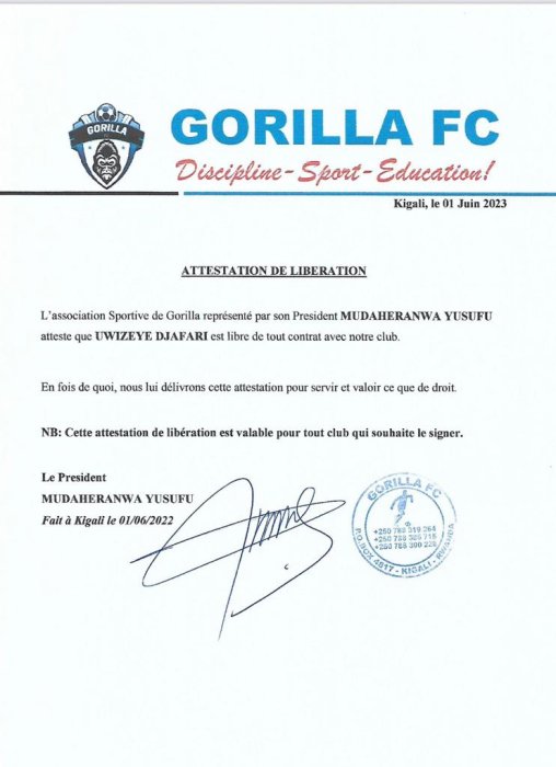 Urwandiko Gorilla FC yandikiye Uwizeye Djafari imusezerera ndetse inamwemerera kwishakira indi kipe
