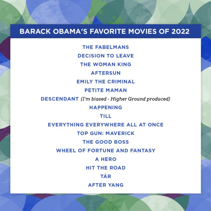 Uretse indirimbo Barack Obama yasangije abamukurikira filime yakunze muri uyu mwaka zirimo The Women King, Happening, Till, A Hero, After Sun, The Good Boss, Hit the road, Petite Maman n’izindi.