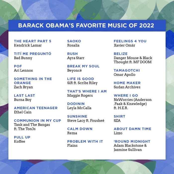 Mu butumwa Obama yanyujije kuri Twitter asangiza abamukurikira izi ndirimbo, yagize ati “Buri gihe nshimishwa no kubasangiza urutonde rw’indirimbo z’umwaka. Uyu mwaka twumvise indirimbo nyinshi nziza, izi ni zimwe mu ndirimbo zanyuze muri uyu mwaka.”