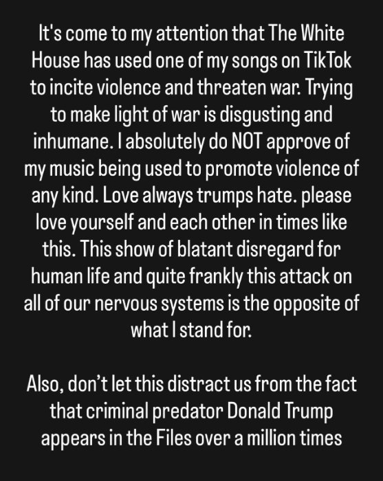 Mu butumwa bwe, Kesha yagize ati “Namenyeshejwe ko White House yakoresheje imwe mu ndirimbo zanjye kuri TikTok mu rwego rwo gushishikariza urugomo no gutera intambara. Kugira intambara nk’aho ari ibintu byoroheje ni igikorwa giteye isoni kandi kidafite ubumuntu. Ntabwo na rimwe nemera ko umuziki wanjye ukoreshwa mu guteza urugomo urwo ari rwo rwose.”