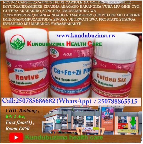 Ku bantu bafite ikibazo cy’imisemburo wa testosterone uri hasi muri KUNDUBUZIMA HEALTH CARE habonetse igisubizo kuribo hifashishijwe imiti gakondo ikoze mu bimera ijana kw’ijana kandi ikaba yizewe ku ruhando mpuzamahanga ndetse akaba ari nta ngaruka igira ku wayikoresheje muri iyo miti twavugamo nka REVIVE CAPSULE, GOLDEN SIX CAPSULE, CA+FE+ZI PLUS CAPSULE
