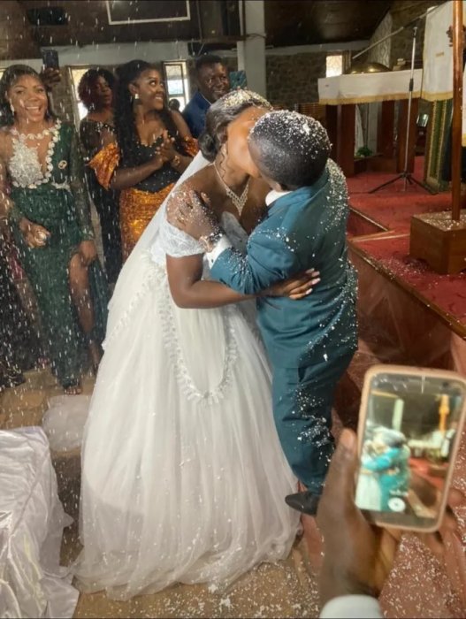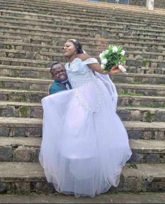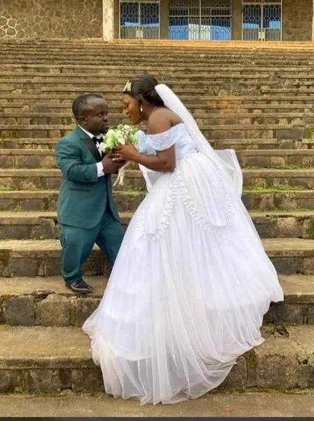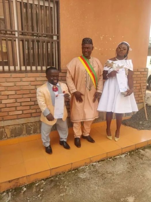Umwarimu wo muri Kameruni w’imyaka 39, Kwoyela Derick, yabenzwe n’abagore benshi kubera ubugufi bwe, yaciye ibintu kubera amafoto yagiye hanze asezerana n’umukunzi we, Kahboh Patience.